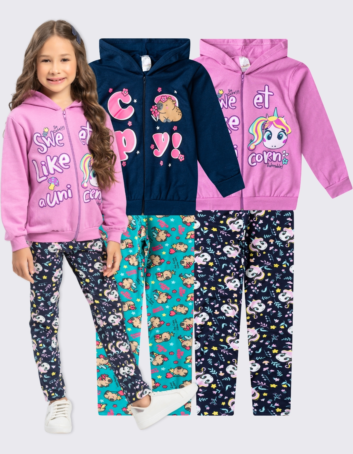 Apresentamos o nosso KIT 2 CONJUNTO MOLETOM MENINA ZÍPER – Feito especialmente para as pequenas aventureiras enfrentarem o frio com estilo e abraçarem a estação com conforto.