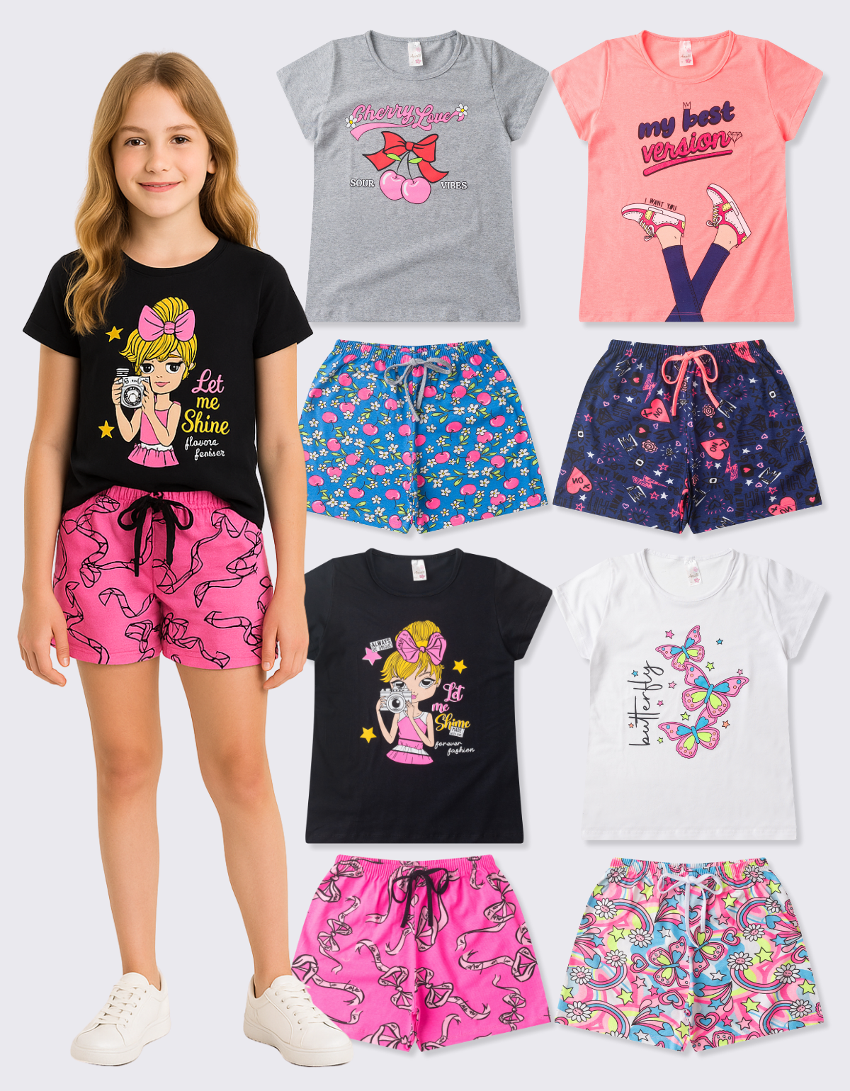 Apresentamos o nosso KIT 4 CONJUNTO SHORTS JUVENIL MENINA – Feito especialmente para as pequenas aventureiras enfrentarem o verão com estilo e com conforto.