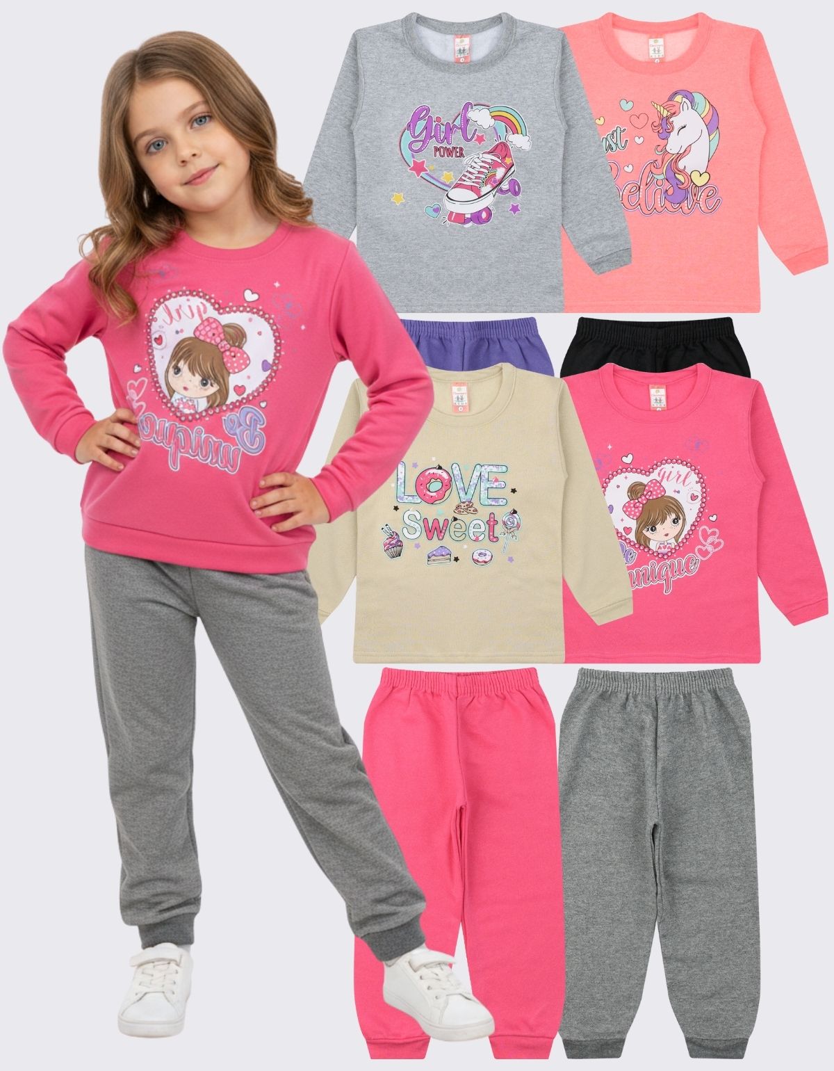 Apresentamos o nosso KIT 4 CONJUNTO MOLETOM INFANTIL GOLA CARECA MENINA INVERNO – Feito especialmente para as pequenas aventureiras enfrentarem o frio com estilo e abraçarem a estação com conforto.