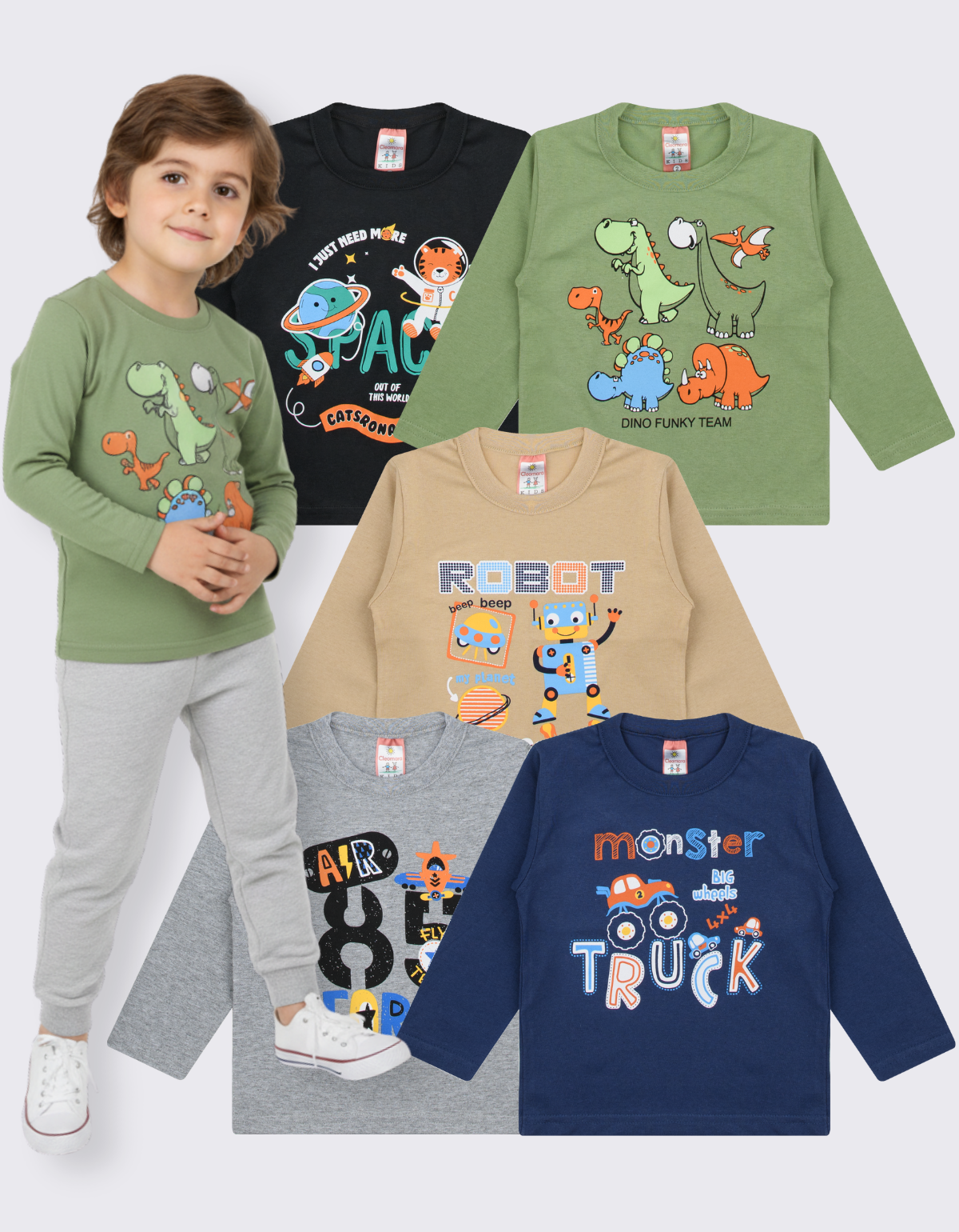 Apresentamos o nosso KIT 5 CAMISETAS MANGA LONGA INFANTIL MENINO INVERNO – Feito especialmente para os pequenos aventureiros enfrentarem o frio com estilo e abraçarem a estação com conforto.
